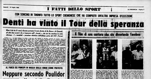 PARIGI. 14. — Lo sport italiano è in festa e, con esso, ancora una volta, lo sport cremonese che ha vissuto oggi a Parigi una delle giornate più entusiasmanti. Dopo i successi di De Rosso (1961) e di Gimondi (1964), la sesta edizione del Giro ciclistico di Francia riservato ai dilettanti è stata vinta da un cremonese di Soncino, il 21enne Mino Denti, il quale, conquistata la maglia gialla a Torino, al termine della quinta tappa, è riuscito a conservarla per altre sei frazioni fin sul traguardo finale del Parco dei Principi di Parigi.