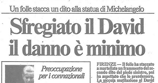 I frammenti di marmo caduti a terra ieri mattina dal secondo dito del piede sinistro della più celebre statua del mondo hanno rotto un incantesimo: non era mai successo che all'interno di un museo fiorentino uno dei capolavori dell'arte venisse danneggiato. Così, il gesto compiuto ieri mattina alle 11.40 all'interno della Galleria dell'Accademia da Piero Cannata, 47 anni, che con un martello che teneva nascosto in una tasca del giubbotto ha spezzato la punta di un dito della scultura, ha riaperto il problema della vulnerabilità delle opere d'arte. L'uomo è stato subito bloccato dai turisti e dai quattro custodi destinati alla vigilanza.