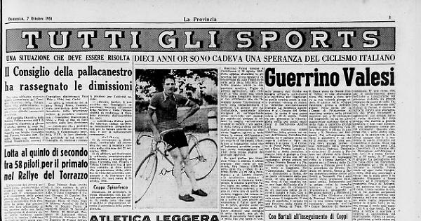 Guerrino Valesi, a 22 anni, giace inanimato: le gambe ancor tese nello sforzo che lo doveva portare vittorioso al traguardo abbracciano ancora il telaio della sua «Bianchi». Ha ancora gli occhi aperti come se la visione della vittoria lo accompagnasse alla meta prossima.