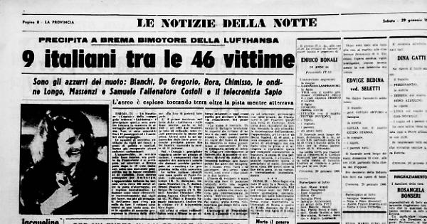 Sul «Convair» precipitato viaggiava anche un gruppo di italiani, i componenti cioè della squadra di nuotatori azzurri che avrebbe partecipato al meeting in programma nella città anseatica.