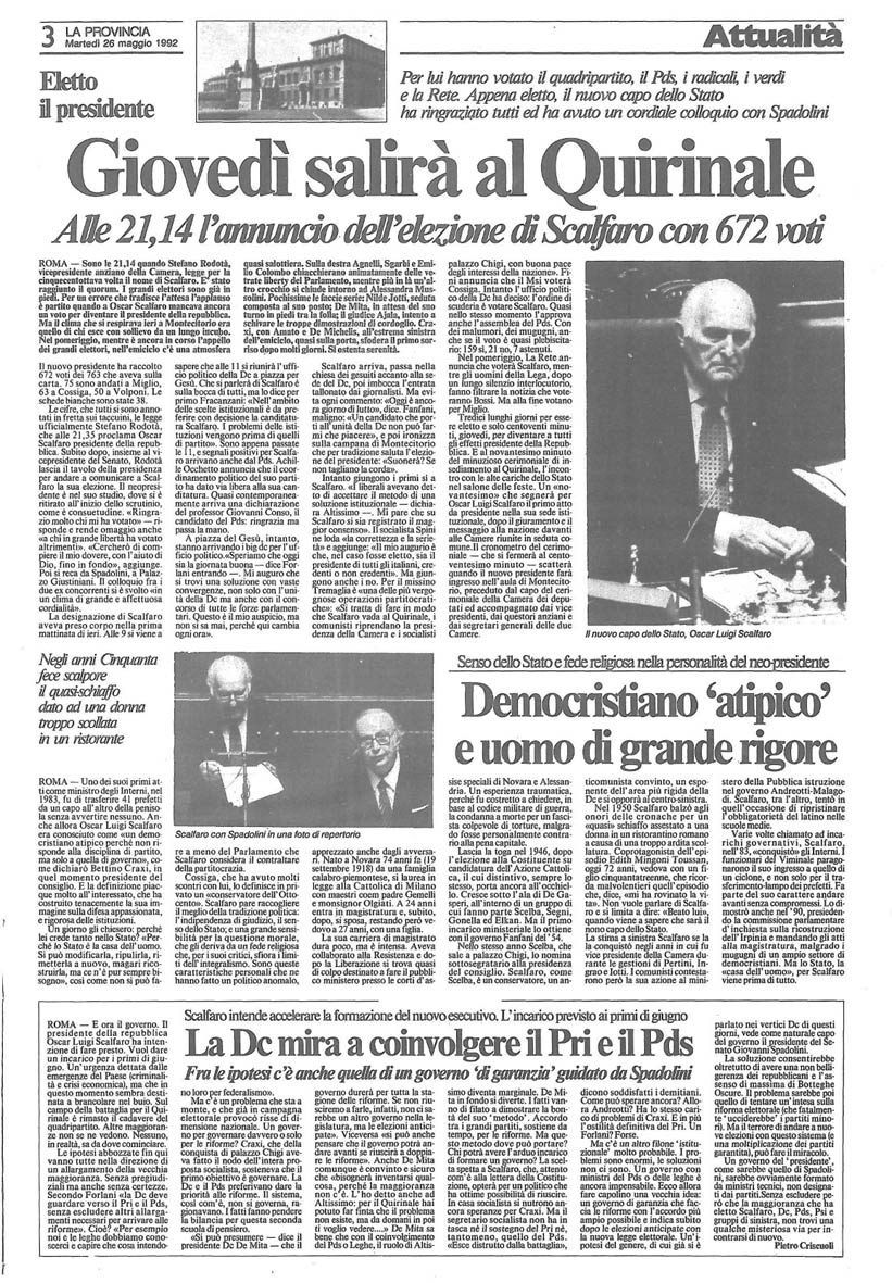 Scalfaro ha 73 anni, è nato a Novara il 9 settembre 1918; sposato, è rimasto vedovo nel 1944, ha una figlia; è stato eletto deputato all'assemblea costituente e da allora è sempre stato riconfermato per undici legislature. Il nuovo presidente della Repubblica ha raccolto 672 voti dei 763 che aveva sulla carta: hanno votato per lui il quadripartito, il Pds, i Verdi, la Rete e il gruppo Pannella. Intanto si sta pensando alla formazione del nuovo governo: non mancano le difficoltà, si parla di un governo istituzionale presieduto da Giovanni Spadolini.