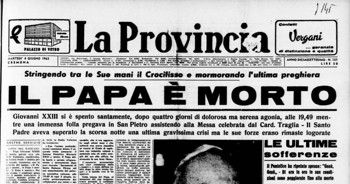 È morto Papa Giovanni XXIII ed il cuore avverte una commozione profonda che è poi l'angoscia degli umili, il dolore dei fedeli, la tristezza di quanti, in ogni parte del mondo, di ogni fede, di ogni lingua, in questi giorni hanno pregato nell'alternarsi di speranze purtroppo senza luce. Eppure questa morte è essa stessa la più grande luce che rischiara la notte del nostro tempo. Quando mai l'agonia di un Papa è diventata, in un modo tanto umano e commovente, un po' come l'agonia del mondo?