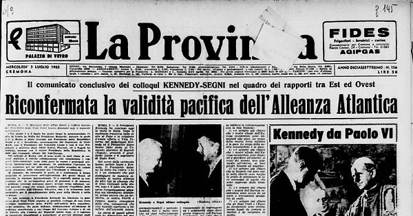 «Nei giorni 1 e 2 luglio ha avuto luogo la preannunciata visita di lavoro in Italia del Presidente Kennedy, durante la quale egli a Roma è stato ricevuto dal Presidente della Repubblica Segni e si è incontrato, accompagnato dal Segretario di Stato Rusk, con il Presidente del Consiglio Leone e con il vice Presidente e ministro degli Affari Esteri, Piccioni, ed a Napoli ha visitato, insieme con il signor Presidente della Repubblica, la sede del Comando alleato del Sud-Europa.