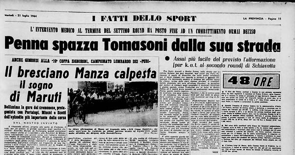 Tra Sante Amonti e Benito Penna, sulla strada per la corona italiana dei pesi massimi, non esiste più Piero Tomasoni, il pugile di Manerbio che nella prima semifinale per il titolo italiano era riuscito a fermare il fugante cremonese. Un intervento medico al termine del settimo round ha chiuso, prima delle dieci riprese previste, il combattimento disputato ieri sera all'Arena Giardino; la decisione del medico di rinviare negli spogliatoi il massimo bresciano è giunta quando ormai Tomasoni era in balia di Benito Penna ed il match aveva assunto un andamento monocorde.