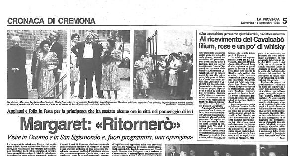 Sembra che Margaret, che è arrivata a Cremona alle 17, accompagnata dal giovane conte Orazio Zanardi Landi e dai rappresentanti della nobile casata cremonese dei Calciati si sia subito trovata a suo agio. Pare inoltre che non abbia ostentato niente di tutto ciò che la letteratura rosa ed i rotocalchi usano alla ricerca di sensazioni e di «scoop» giornalistici.