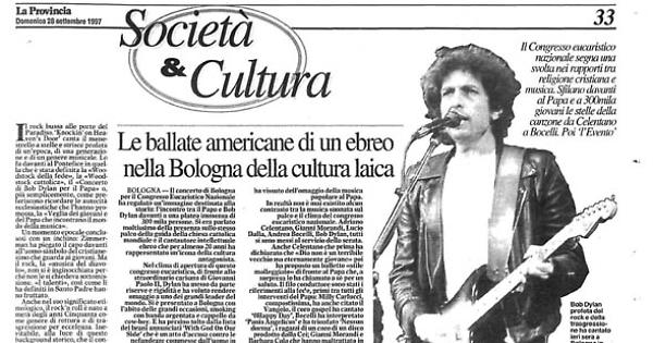 Il concerto di Bologna per il Congresso Eucaristico Nazionale ha regalato un'immagine destinata alla storia: l'incontro tra il Papa e Bob Dylan davanti a una platea immensa di 300 mila persone. Si era parlato moltissimo della presenza sullo stesso palco della guida della chiesa cattolica mondiale e il cantautore intellettuale ebreo che per almeno 20 anni ha rappresentato un'icona della cultura antagonista.