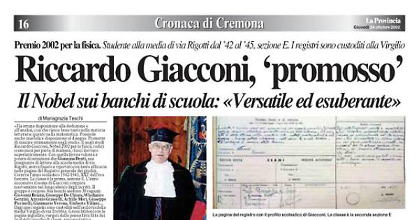 A quel tempo preside della Virgilio era Salvatore Sfilio. In quelle pagine, uno spaccato degli anni cremonesi del premio Nobel, sfollato dalla Milano bombardata e ospitato dalla zia materna, Giulia Canni, nella casa di via Robolotti. E insieme un ritratto del futuro premio Nobel, quello di un ragazzino «educato e dai modi garbati e disinvolti», simpatico e ben voluto dai compagni, ai quali passa i compiti in classe di matematica. Dotato di «una vivacità esuberante» che il piccolo Giacconi riesce a stento a frenare. Soprattutto durante le ore di educazione fisica.