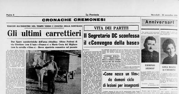 Mario Costa imbarca i suoi approvvigionamenti in un caratteristico veicolo a quattro ruote, che viene trainato dalla «Gina» — una cavalla bianca umile e paziente che ha già visto per vent'anni le albe ed i tramonti cremonesi — e gira tra i caseggiati della sua zona commerciale, puntuale come accade per i «menalatte» nei loro itinerari quotidiani. Anche Costa, come Pedroni, ha ereditato dal padre l'amore per la specie equina: esercita la sua attività da quando ha avuto dalla maestra la pagella della quinta elementare, perciò da circa mezzo secolo, sempre affiancato da cavalle bianche che si sono trasmesse doverosamente ti nome di «Gina».