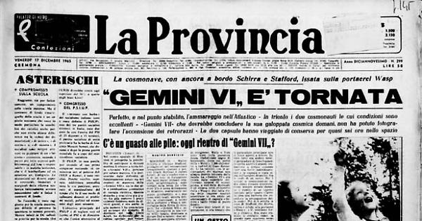 HOUSTON, 16. — Walter Schirra e Thomas Stafford, protagonisti del sensazionale inseguimento spaziale e poi, con Frank Borman e James Lovell, di un «rendez vous» e di un volo in formazione che apre nuovi immani orizzonti all’astronautica, sono tornati sulla terra. La «Gemini VI» è scesa dolcemente in Atlantico, esattamente nel punto prestabilito e i due sono stati issati, ancora dentro la cosmonave, a bordo della portaerei «Wasp», ammiraglia della flotta di recupero. La «Gemini VII», intanto, proseguiva la sua corsa nello spazio, destinata a durare fino a sabato: due settimane di galoppata orbitale.