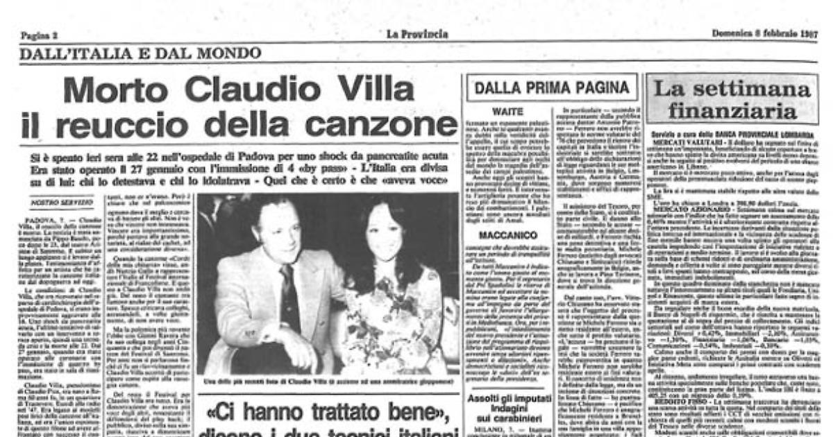 Le condizioni di Claudio Villa, che era ricoverato nel reparto di cardiochirurgia dell'ospedale di Padova, si erano improvvisamente aggravate alle 16. Uno shock da pancreatite acuta, l'ultimo tentativo di salvarlo con un intervento a torace aperto, quindi una seconda crisi e la morte alle 22. Dal 27 gennaio, quando era stato operato alle coronarie con l'immissione di quattro by pass, era stato in sala di rianimazione.
