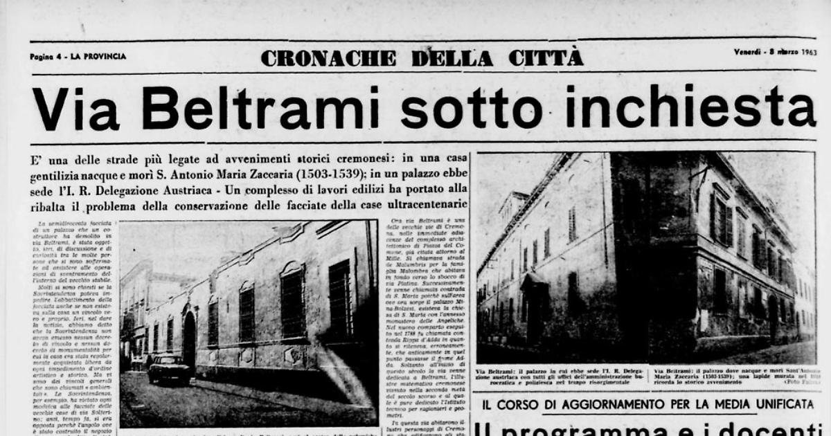 Ma in questa via ebbe a nascere ed a morire anche il Santo Antonio Maria Zaccaria. Queste schematiche notizie storiche possono essere sufficienti a giustificare l'intervento della Sovrintendenza la quale ha già disposto tutto un piano per la conservazione di molte facciate di palazzi e di case della città. È già a buon punto, per esempio, il ripristino del palazzo Anselmi in via Cesare Battisti ore sarà salvata parte della facciata e lo scalone e sono allo studio il salvataggio delle facciate di altri tre palazzi.