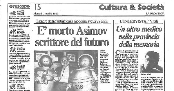 Con Isaac Asimov scompare il più popolare autore di letteratura fantascientifica, ma anche un fecondo saggista e divulgatore scientifico. I suoi 500 libri, modulati sui temi della mitologia e dell'ecologia, della ricerca biblica e della fantascienza, hanno fatto sognare milioni di lettori e altrettanti ne hanno trascinati nel mondo della scienza.