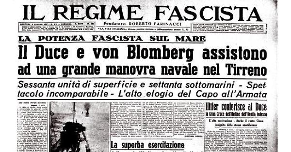 (...) La 'radio intanto annuncia che le navi cominciano ad entrare nel porto. La folla da ogni parte leva altissimi gli alala al Duce e a S. E. Blomberg, all'Italia ed alla. Germania. Sono le 16,45 quando il Duca d"Aosta entra nelle nostre acque. Partono subito agilissimi otto motoscafi della R. Manna, ver prendere a bordo il ' Ministro della Guerra del Reich e le a'utorità del seguito e quanti dovranno sbarcare a Sapoli Sul piazzale, dove prestano servizio d'onore i carabinieri ed i metropolitani in tenuta di gala si fanno avanti le maggiori autorità con a capo il Prefetto, il Segretario federale e il Podestà. Gli altoparlanti avvertono che lo sbarco si sta effettuando. Le musiche intonano gli inni, le salve d'artiglieria continuano, a bassa quota incrociano sul Beverello- apparecche che recano il saluto dell'Aria ...