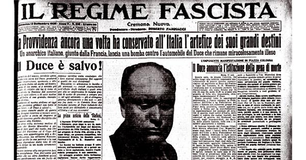 Un anarchico italiano giunto dalla Francia lancia una bomba contro l'automobile del Duce che rimane miracolosamente illeso