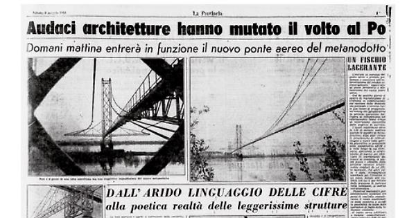 (...) Le caratteristiche principali dell'attraversamento sono le seguenti: Distanza ira i piloni di sostegno vi. 320,40 ;. Altezza in.mezzana del tubo sul livello normale ni. 15: Altezza dei piloni da terra metri 47,80; Altezza delle pile in muratura m. 8; Distanza degli ancoraggi dai piloni m. 140; Diametro esterno della tubazione 13" mm. 343; Spessore della tubazione mm. 12; Pressione massima, di esercizio del gas 60 alvi.; Monta della tubazione m. 4,52; Larghezza della passerella cm. 65; Peso complessivi di tutte le parti metalliche kg. 400.000; Peso complessivo di tutte le parti in cemento armato 5.509 tonnellate; Lunghezza complessiva dell'attraversamento m. 920,80; Profondità media dei pali di fondazionc m. 25; Ore lavoratila per l'intera esecuzione 45 mila. Le opere in muratura, completamente in cemento armato, comprendono: tre blocchi di fondazione dei piloni centrali e due blocchi di ancoraggio delle funi. Tutti si sopraelevano di circa un metro oltre la quota massima degli argini circostanti, in modo da impedire che i corpi galleggianti nelle condizioni di massima piena, possano investire le strutture metalliche. La stabilità sia delle pile in acqua sia di quelle di ancoraggio è garantita da una fitta palificazione costituita da 292 pali trivellati e pressati che raggiungono la profondità mas. di mi. 28. (...)