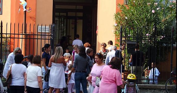 Genitori e alunni davanti alla materna Franceschini di Crema