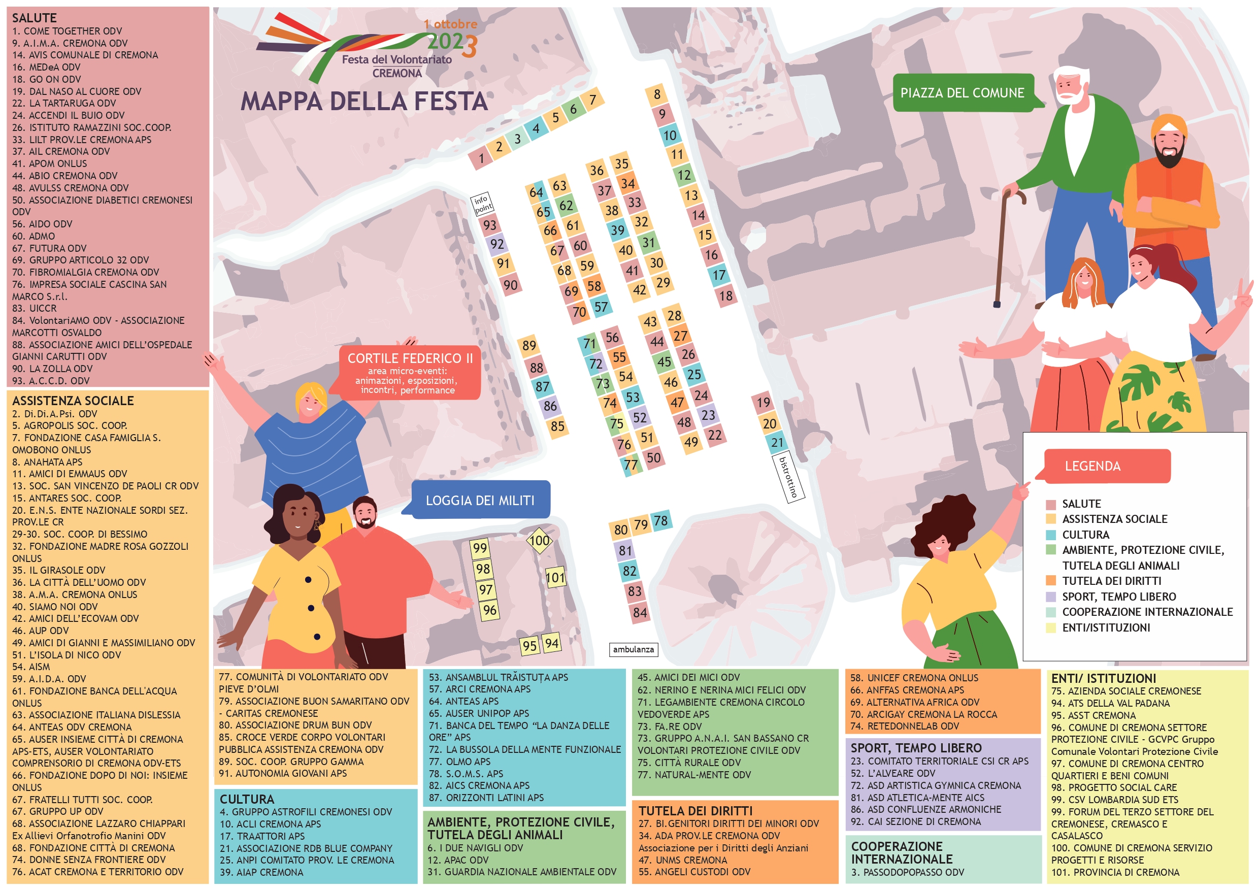 ADMO ODV, AGROPOLIS SOC. COOP., AIAP Cremona, AIL CREMONA ODV, ALTERNATIVA AFRICA ODV, AMICI DEI MICI ODV, AMICI DELL'ECOVAM ODV, AMICI DI EMMAUS ODV, AMICI DI GIANNI E MASSIMILIANO ODV, ANAHATA APS, ANFFAS CREMONA APS, ANGELI CUSTODI ODV, ANSAMBLUL TRĂISTUȚA APS, ANTARES SOC. COOP., ANTEAS APS, ANTEAS ODV CREMONA, APAC ODV, ARCI CREMONA APS, ARCIGAY CREMONA LA ROCCA, ASD ARTISTICA GYMNICA CREMONA, ASD ATLETICA-MENTE AICS, ASD CONFLUENZE ARMONICHE, ASSOCIAZIONE AMICI DELL'OSPEDALE GIANNI CARUTTI ODV, ASSOCIAZIONE BUON SAMARITANO ODV - CARITAS CREMONESE,
