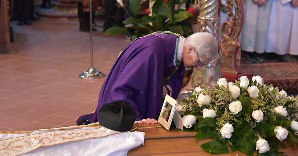 SABBIONETA (Villa Pasquali) - Il vescovo che si inginocchia e bacia la bara che più tardi verrà portata a spalla al cimitero dai ‘ragazzi’ che una volta erano i suoi chierichetti: in questi due gesti si racchiude il profondo significato dell’affetto con cui la chiesa cremonese e i parrocchiani hanno voluto salutare per l’ultima volta don Pietro Riccardi. Gremitissima la chiesa del Bibiena con una trentina di sacerdoti a concelebrare insieme al vescovo Dante Lafranconi. ma forte anche la presenza della comunità civile con il sindaco Aldo Vincenzi, il vice Luigi Barili e il gonfalone del Comune di Sabbioneta. Presente anche la superiora generale delle Figlie di Maria Missionarie suor Fiorenza Amato. Don Pierino, come aveva chiesto, è stato sepolto nella nuda terra.