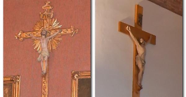 Il crocifisso nella sala del Consiglio comunale e a destra quello sulle pareti dell'auditorium