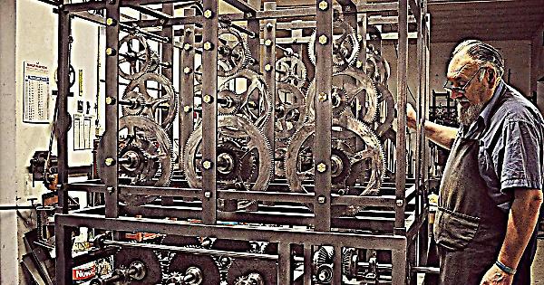 Il maestro Gorla accanto al meccanismo dell'orologio