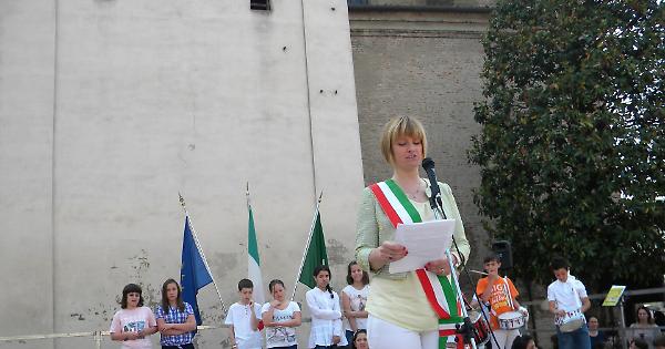 PIADENA — Festa della Repubblica e dei bambini nella mattinata di martedì 2 giugno a Piadena. L’evento organizzato dall’Unione dei Comuni Piadena-Drizzona e dall’Istituto comprensivo Sacchi, ha visto in piazza Garibaldi decine e decine di bambini cantare per rendere onore alla ricorrenza civile e per salutare la conclusione dell’anno scolastico 2014/2015. Per le amministrazioni erano presenti il sindaco di Drizzona Nicola Ricci e il vicesindaco di Piadena Elisa Castelli mentre le scuole erano rappresentate dal dirigente Sergio Pinsi. Il coro e la banda della scuola, dirette dal maestro Francesco Badalotti, hanno dato il via all’appuntamento con l’Inno di Mameli cantano anche da tutti i presenti.
