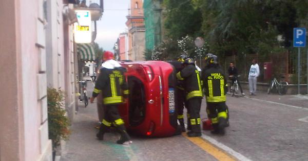 Casalmaggiore - Spettacolare ribaltamento per fortuna senza gravi conseguenze all'altezza del numero civico 111 di via Cairoli. Una Renault Clio condotta da un giovane ha 'speronato' una Croma guidata da una donna impegnata in una manovra di parcheggio. A causa dell'impatto la Clio si è rovesciata su un fianco andando a invadere prima la pista ciclabile e poi il marciapiede in quel momento deserti fermando la sua corsa a un palmo dalle vetrine del bar Patty. Tre le persone coinvolte, un uomo e due donne, per i quali si è reso necessario il ricovero in ospedale in via del tutto precauzionale.