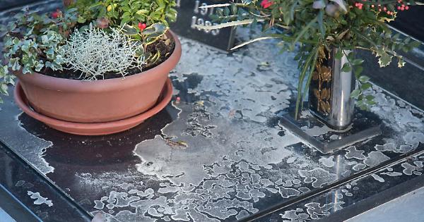 Una delle tombe imbrattate dalla resina dei cipressi del cimitero del capoluogo