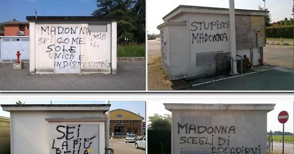 VIADANA - Una mano ignota, una bomboletta spray di vernice nera, tre cabine elettriche e la protezione del buio della notte: sono gli ingredienti di un ‘mistero’ che da qualche settimana avvolge Viadana, da quando cioè un writer dall’identità sconosciuta (qualcuno userebbe il termine meno ‘gentile’ di imbrattatore) ha cominciato a lasciare messaggi sul cemento scrivendo frasi che possono avere diverse interpretazioni. Un fan di Madonna o un fervente religioso?