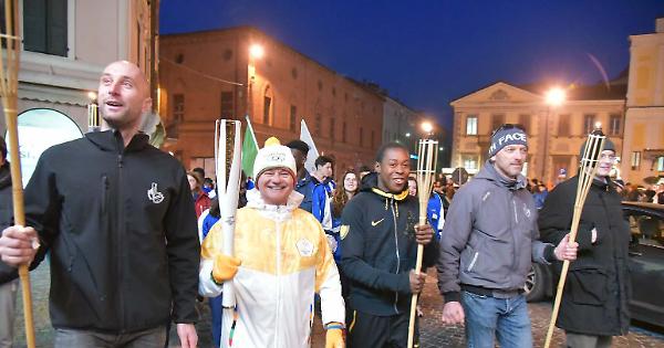 CASALMAGGIORE - Al centro la fiaccola olimpica ufficiale portata dal tedoforo Gianpaolo Fattori (spenta, perché ieri è stato acceso il braciere di Pyeongchang in Corea del Sud). Ai lati le fiaccole simboliche, accese, portate da due campioni olimpici come Gianluca Farina e Simone Raineri e dal campione italiano dei 200 metri, anch'egli olimpionico, Fausto Desalu.