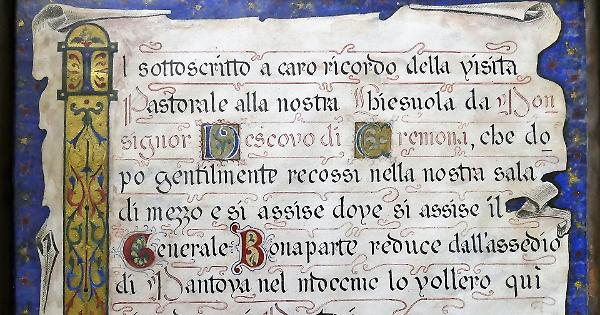 PIADENA DRIZZONA - Tra i vari personaggi, noti e meno noti, che in un passato anche lontano hanno visitato Piadena, ci sarebbe da annoverare, niente meno, che il generale Napoleone Bonaparte, il fondatore del primo Impero francese. La prova, indiretta, di una sua presenza nel nostro territorio viene fornita da una pergamena, custodita tra i documenti della sua ampia raccolta dall’ex vicesindaco Stefano Martinelli. Nel testo in questione, sottoscritto da Teodoro Rossi vedovo di Adelaide Baguzzi, Ancilla Bertoli, vedova di Giovanni Baguzzi, e Giovanni Baguzzi del ‘fu dottor Vittorio’, si parla della volontà di ricordare la ‘visita pastorale alla nostra chiesuola’ - quella cioè di via Platina - del ‘Monsignor Vescovo di Cremona, che dopo gentilmente recossi nella nostra sala di mezzo (all’interno della proprietà attualmente di Martinelli, nda) e si assise dove si assiste il Generale Bonaparte, reduce dall’assedio di Mantova’. Il documento reca la data del 1922, anno in cui vescovo, anzi arcivescovo, era Giovanni Cazzani (Samperone, 4 marzo 1867 - Cremona, 26 agosto 1952).