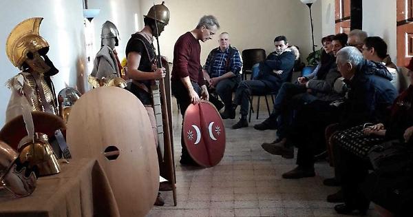 PIADENA DRIZZONA - Sorpresa. C’era anche un legionario in carne e ossa, al Museo Archeologico Platina per il primo appuntamento di ‘Gesti & Materie’, una serie di 4 incontri a cadenza mensile che offrono approfondimenti tematici per un pubblico di adulti e di appassionati di archeologia e di antichità desiderosi di qualcosa di diverso rispetto alla tradizionale visita. Ad impersonare il fante è stato il giovane Alessandro Magnani di Piadena, archeologo, dallo scorso dicembre impegnato per il servizio civile nei settori culturali del Comune, ossìa biblioteca e museo. Il tema del pomeriggio era accattivante - ‘Fare il militare ai tempi di Bedriacum. L’equipaggiamento, l’addestramento e le tattiche belliche del legionario romano’ - ed è stato egregiamente sviluppato dall’archeologo e antropologo Corrado Re, fondatore e titolare di ‘Res Bellica’, realtà di Luzzara (Reggio Emilia) che riunisce storici e archeologi, con un’esperienza più che decennale nella realizzazione di eventi di rievocazione storica, living history e museum theatre.