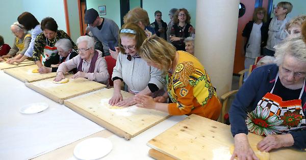 CINGIA DE’ BOTTI (22 maggio 2019) - «Impastare, stendere, ranare, scannellare». Rina Poletti da Ferrara, ‘sfoglina’ professionale, ieri mattina ha riassunto così le quattro fasi essenziali per realizzare la migliore pasta sfoglia e lo ha fatto durante l’inaugurazione della cucina terapeutica installata presso il Nucleo Alzheimer della Fondazione Germani grazie al contributo dei Lions Cremona Europea e Cremona Duomo. A seguire le sue indicazioni, mentre il maestro di sfoglia Gianpaolo Chiozzi armeggiava sul tavolo con maestria, sono state poi alcune ospiti del reparto, che hanno davvero messo le mani in pasta.