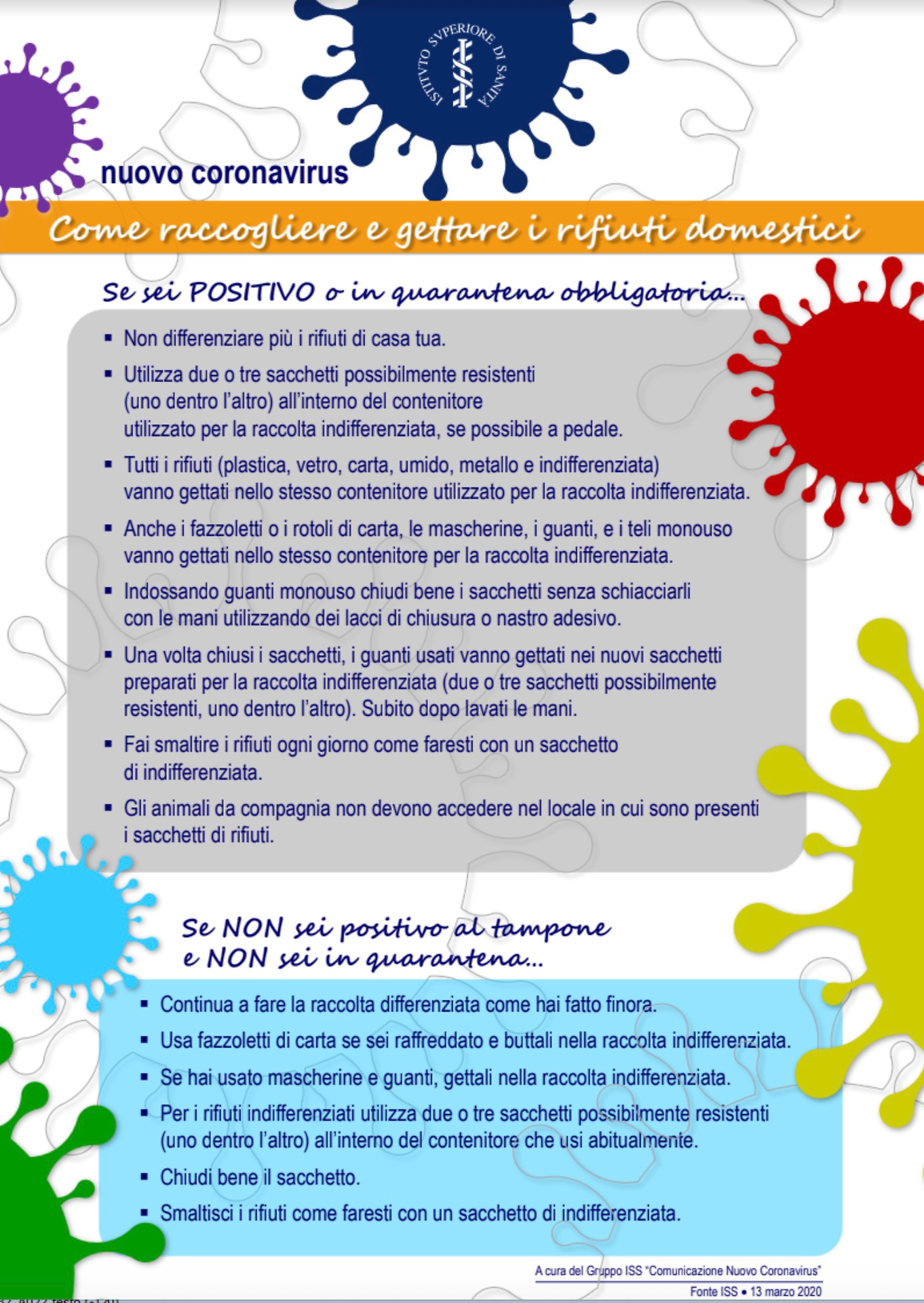 Ad esempio viene raccomandato che nelle abitazioni in cui sono presenti soggetti positivi al tampone, in isolamento o in quarantena obbligatoria, sia interrotta la raccolta differenziata e che tutti i rifiuti domestici, indipendentemente dalla loro natura e includendo fazzoletti, rotoli di carta, i teli monouso, mascherine e guanti, siano considerati indifferenziati e pertanto raccolti e conferiti insieme. Ci sono poi indicazioni per i soggetti non positivi e non in quarantena obbligatoria, cioè quelle di non interrompere la raccolta differenziata. A scopo cautelativo, fazzoletti o rotoli di carta, mascherine o guanti eventualmente utilizzati, dovranno essere smaltiti nei rifiuti indifferenziati.