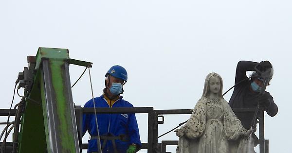 SAN GIOVANNI IN CROCE (17 maggio 2020) - Il tempo, le intemperie e l’inquinamento l’avevano fatta diventare di un colore grigio scuro e per questo motivo, volutamente nel mese mariano, due volontari del paese, Romano Feroldi e Luca Visioli, ieri mattina hanno deciso di ripulirla utilizzando un potente getto d’acqua. Parliamo della statua in cemento della Madonnina che si staglia dalla sommità dell’edificio in cui ha sede il bar Sport di San Giovanni in Croce, ben visibile a quanti percorrano la provinciale Asolana diretti verso Casalmaggiore. Una presenza che a qualcuno in passato ha fatto anche venire il dubbio che quella immagine indicasse la presenza di una chiesa. Invece fu Giuseppe Borsi, ex proprietario, scomparso parecchi anni fa, del bar, che fece issare il simulacro con un ingegnoso sistema di pali in legno dall’impresa edile di Annibale Stringhini, a metà degli anni Cinquanta. Battista Cremona, l’ex titolare del bar Sport e attuale proprietario dell’immobile, sostiene che l’operazione avvenne nel 1955. In paese c’è chi dice appena dopo. Il periodo, comunque, era quello, a indicare che la Madonnina ha superato abbondantemente i sessant’anni.