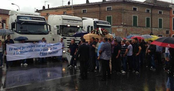 GUSSOLA - La bara portata a spalla con amici e dipendenti, senza ombrello, a seguirla incuranti della fitta pioggia che cade. Davanti alla chiesa parrocchiale cinque tir parcheggiati che salutano l'arrivo del feretro con il potente suono dei clacson e uno striscione con poche parole sincere e toccanti 'Tu sarai per sempre con noi sulle strade, è la nostra vita, come è stata la tua. Ciao Vainer'. Sono alcune delle immagini più intense del funerale, celebrato mercoledì mattina, di Luigi Vainer Lombardi scomparso lunedì a 49 anni a seguito di una malattia. Tanta tantissima gente ha voluto dare l'addio all'imprenditore titolare dell'omonima ditta di autotrasporti che conta una settantina di dipendenti. La chiesa non è riuscita a contenere tutti coloro che erano presenti anche perchè una parte dell'edificio religioso è chiusa al pubblico. A celebrare le esequie don Umbero Leoni e don Alfredo Assandri.