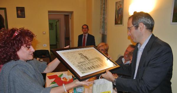 Umberto Ambrosoli riceve una stampa da Enrica Campanini