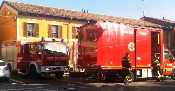 PIADENA - Due mezzi dei vigili del fuoco in azione, nella mattinata di sabato, in piazzetta a Piadena, in seguito alla perdita di acido cloridrico da un fusto collocato presso il magazzino di un colorificio, in vicolo Lavacchiello.