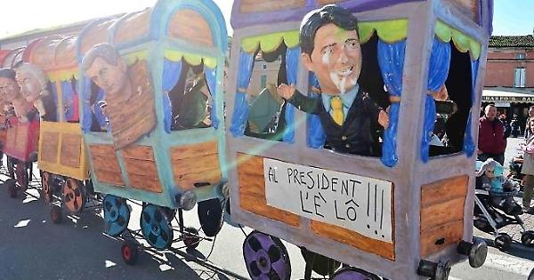 Ad aprire la sfilata è stato il trenino, seguito da cinque carri. Il primo, in stile antico Egitto, era quello dei coscritti del 1996, che hanno accompagnato il loro ‘tour’ con il suono dei fischietti. A seguire un allestimento dal tono ironico: vista la situazione, ‘solo i marziani ci salveranno?’. Spazio poi alla politica, con un altro trenino condotto dal presidente della Repubblica. Dietro di lui, nel primo vagone, la figura di Pier Luigi Bersani e dietro Matteo Renzi con la scritta ‘El president l’è lu’.