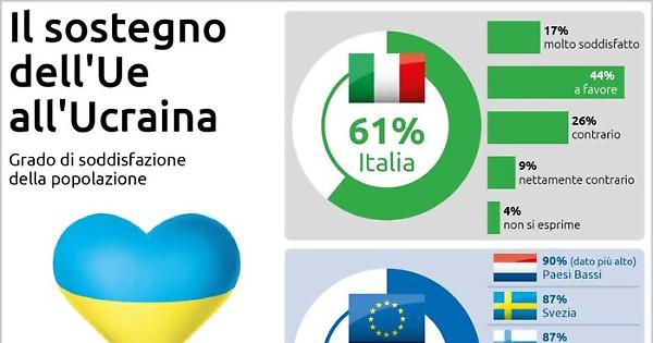 Se si torna a guardare alla reazione dell'opinione pubblica alla linea d'azione pro-Kiev - espressa nell'Eurobarometro con un campione di 26.376 persone su 27 Paesi membri -, il nostro Paese si trova in linea con i Ventisette sul sostegno dei cittadini alla fornitura di aiuti umanitari (apprezzata dal 91% in Ue e dall'89% in Italia) e all'accoglienza delle persone in fuga dalla guerra (a favore l'88% in Ue, il 91% in Italia). Anche l'erogazione di aiuti finanziari all'Ucraina è appoggiata dal 77% degli intervistati (in Italia il 76%), mentre l'imposizione di sanzioni economiche al governo, a imprese e a singoli cittadini russi vede l'approvazione il 74% degli intervistati sia in Ue che in Italia.