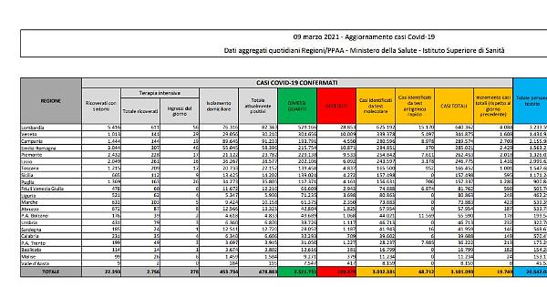 ROMA (ITALPRESS) - Tornano a crescere i casi di coronavirus in Italia. Secondo i dati forniti dal Ministero della Salute, i nuovi contagiati sono 19.749 contro i 13.902 registrati ieri. Questo a fronte di 345.336 tamponi processati, numero imponente che fa scendere l'indice di positivita' al 5,7%. I morti sono 376. I guariti sono 12.999, mentre gli attuali positivi aumentano di 6.350 unita' attestandosi a 478.883. Per quanto riguarda i ricoveri crescono nelle ultime 24 ore, con 22.393 degenti nei reparti ordinari (ieri era sono 22.393), idem nelle terapie intensive, con 2.756 degenti (+56) con 278 nuovi ingressi. In isolamento domiciliare vi sono 453.734 persone. Per quanto riguarda le regioni, la Lombardia si conferma quella con il maggiore numero di nuovi contagiati (4.084), seguita da Campania (2.709) ed Emilia Romagna (2.429). (ITALPRESS). tai/sat/red 09-Mar-21 18:33