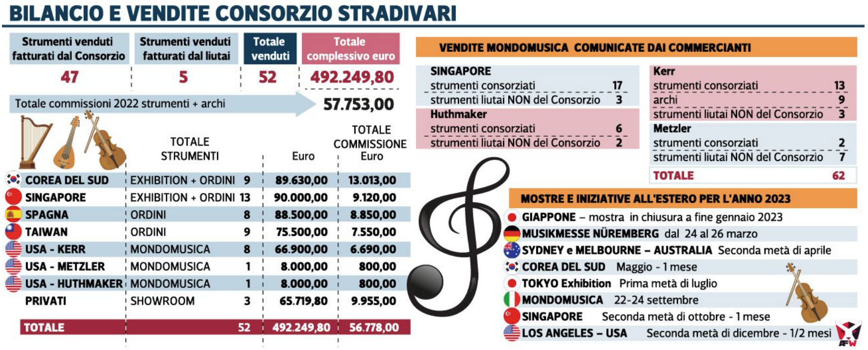 CREMONA - Quasi mezzo milione di incassi — 492.249 euro per l’esattezza — per un totale di 52 strumenti venduti: sono i dati con cui il Consorzio Antonio Stradivari chiude l’attività del 2022.