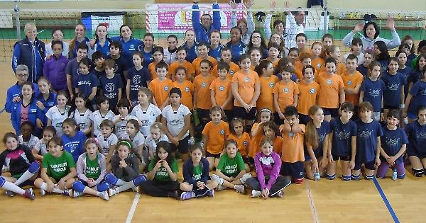 Foto di gruppo per tutti i partecipanti alla festa del minivolley che si è tenuta al Pala Mg.KVis di Piadena