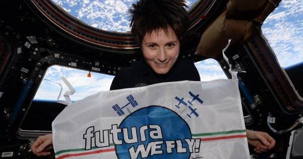 Samantha Cristoforetti nello spazio con la bandiera del WeFly! Team