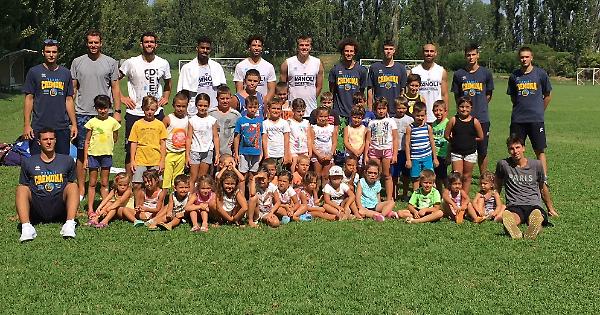 CREMONA - Primo allenamento della Vanoli nella mattina di mercoledì 22 agosto alla Canottieri Flora. Tutti presenti con il solo Tre Demps fermo in attesa di terminare le visite mediche. A fine seduta foto di gruppo con i bambini del Grest della società. Nel pomeriggio seduta al PalaRadi alle 18.