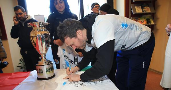 Travis Diener autografa una tshirt Campioni davanti alla Coppa Italia