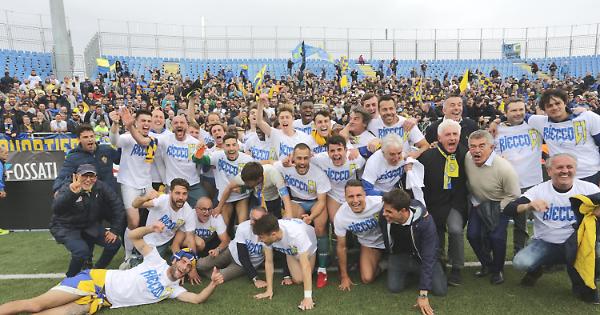 NOVARA (12 maggio 2019) - La Pergolettese è in serie C. Nello spareggio di Novara i gialloblu allenati da Contini hanno battuto il Modena 2-1 e hanno meritatamente centrato la promozione. La Pergolettese è scesa in campo con il piglio giusto ed è passata in vantaggio con Morello, ha subito un pareggio rocambolesco (autorete di Bortoluz) ma poi si è rimessa a proporre gioco e nel finale del primo tempo Franchi ha messo a segno il gol del 2-1. Vantaggio che poi è risultato decisivo. Nella ripresa, infatti, il Modena ha cercato di premere ma - a parte una bella occasione dell'ex Ferrario - non è mai stato pericoloso. Al 95' è esplosa la festa fra i giocatori e i tifosi al seguito.