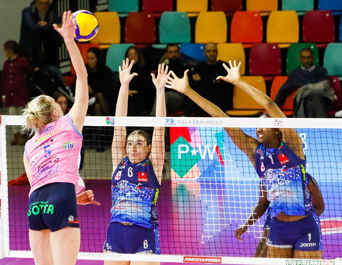 FIRENZE - La Vbc Trasporti Pesanti Casalmaggiore domina lo scontro diretto del PalaWanny con Firenze, ottiene la terza vittoria consecutiva (non succedeva dal 9 novembre 2019) e guadagna tre punti pieni che le consentono di spingersi al settimo posto in classifica con Bergamo, sesta, già nel mirino ad una sola lunghezza di distanza. Le ragazze di coach Pistola hanno dimostrato di essere formazione solida, non priva di momenti di appannamento (finale di secondo set e fase centrale del terzo), ma di avere armi e carattere per uscirne alla grande, trascinate, come sempre dalla solita Frantti e da una Dimitrova che pure non al meglio dà una gran mano in attacco.