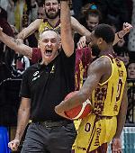 Payton Willis in possesso palla a Sassari. In sfondo, la gioia di coach Luca Bechi e di tutti i tifosi oroamaranto al termine della gara vinta dalla Juvi contro la Libertas Livorno (FotoLive/Sessa)