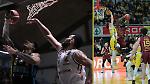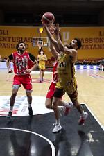 Il presidente Aldo Vanoli con la Coppa Italia 2019. A destra l giovane play Tommaso Vecchiola in possesso palla