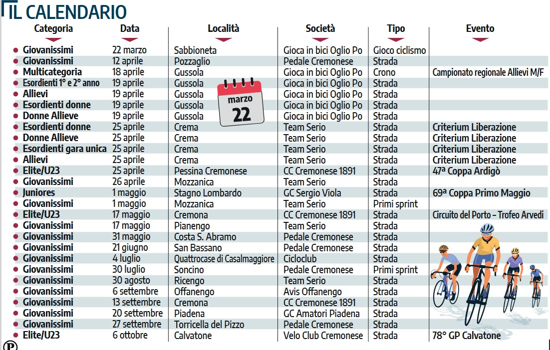 Nell’agenda degli impegni ci sono poi le gare di Giovanissimi. Sono loro ad aprire il calendario in provincia, con la prova di Pozzaglio del Pedale cremonese, prima tappa del circuito Martinelli-Vicini che raccoglie più corse. Quest’anno c’è la particolarità di prove organizzate da società cremonesi fuori provincia, una a Sabbioneta e due a Mozzanica, e di un team mantovano che propone una corsa a Quattrocase di Casalmaggiore. Un calendario che anche a livello di piccoli protagonisti in bici si è ridotto nel corso degli anni e il programma in partenza presenta un vuoto tra giugno, luglio con solo due appuntamenti. E la speranza degli appassionati che possano inserirsi nuove date strada facendo per vivacizzare ancora di più il movimento.
